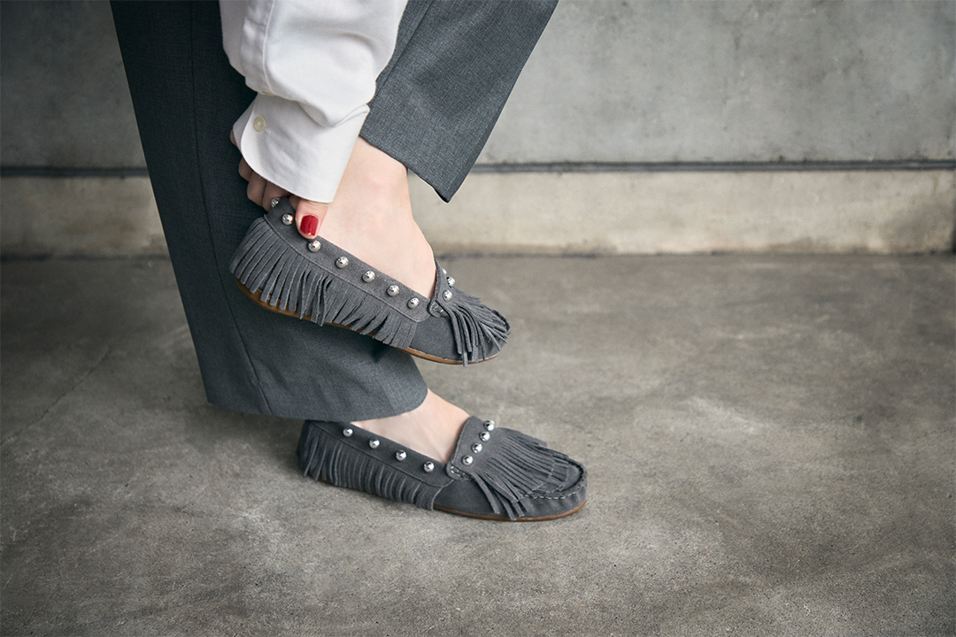 しなやかなスウェードレザーに、繊細なフリンジとスタッズを施したモカシンシューズ。
