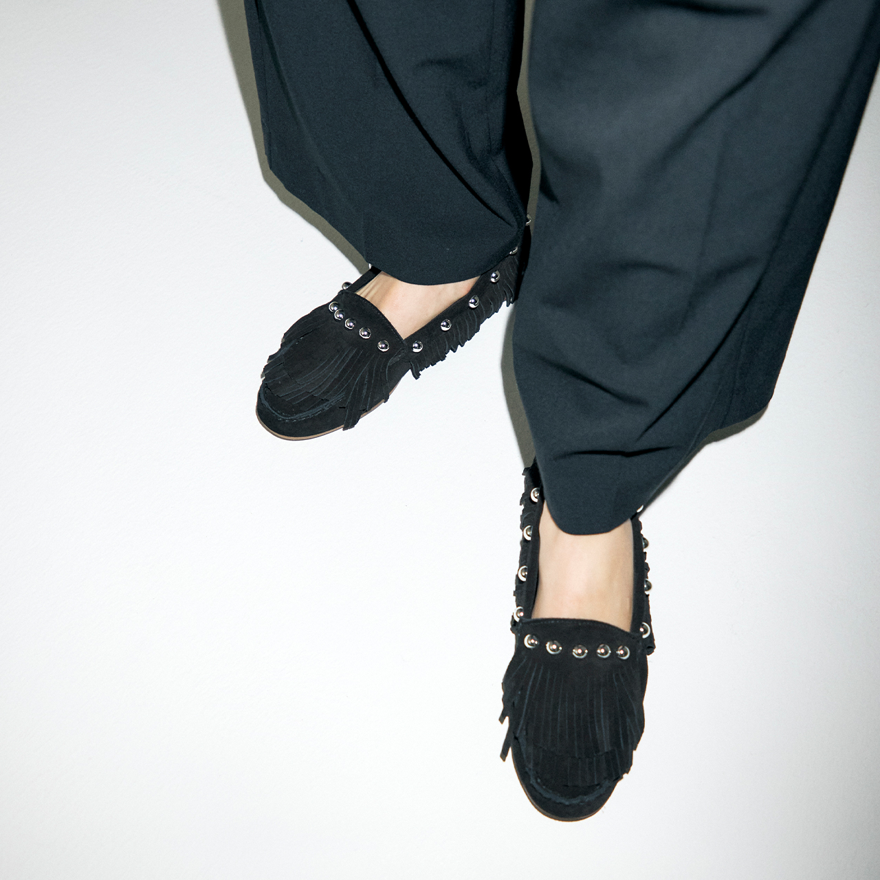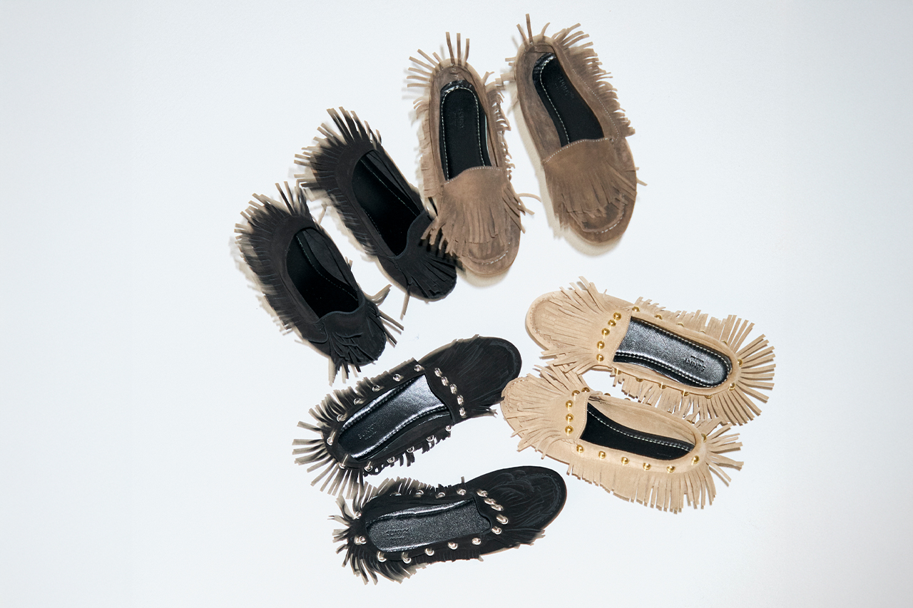 SACOモカシン用の新木型“SACO”がもたらす、毎日でも履きたくなる快適なフィッティング。 大胆に揺れるロングフリンジがミニマルな佇まいに動きを与え、 シャープなシルエットが日々の装いにエッジを添える。 環境に配慮したイタリア製レザーは、美しさと意志を兼ね備えています。 洗練と余裕を足元に宿す、大人のためのモカシンです。