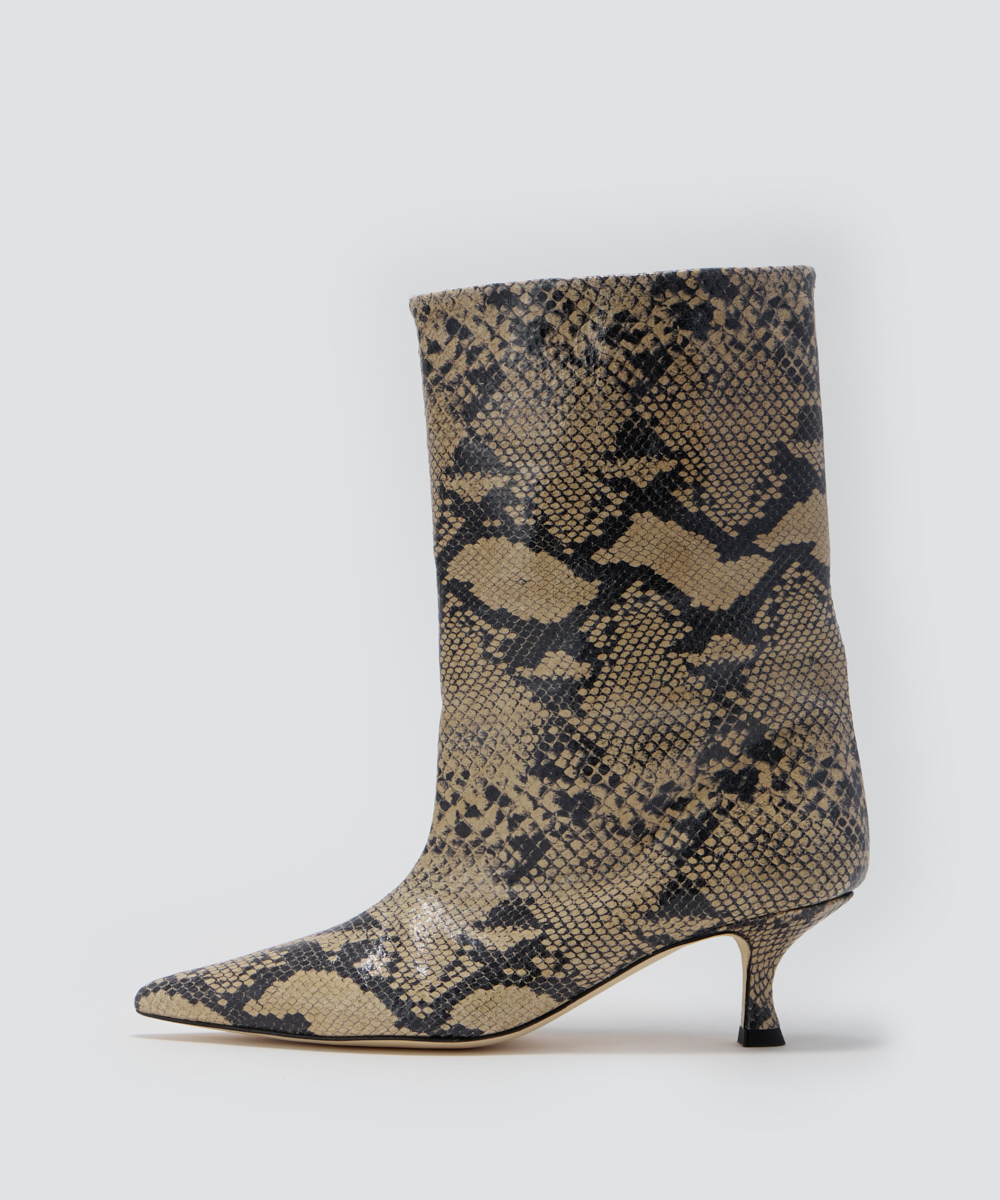 研ぎ澄まされたポインテッドトゥと長めのノーズが描くシャープなラインはそのままに、表情豊かなパイソン柄が足元にさりげない存在感を添えます。